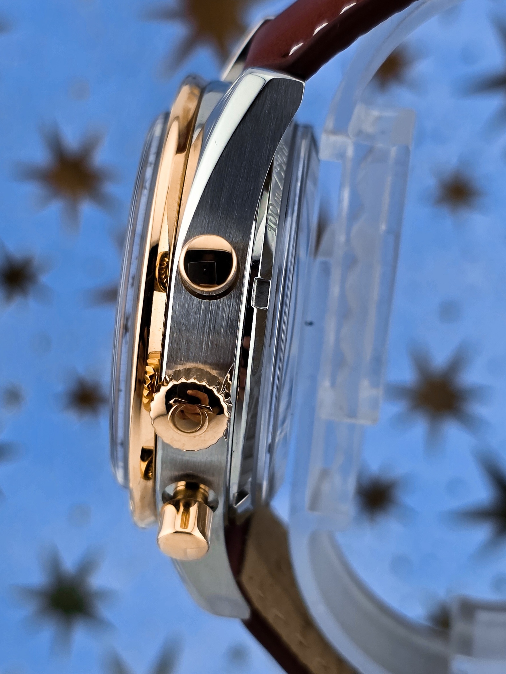 Powered by Omega’s acclaimed Co-Axial Caliber 9300 with 60 hours of power reserve, this Speedmaster ’57 delivers exceptional precision through column-wheel chronograph technology and silicon Si14 balance spring. The revolutionary Co-Axial escapement reduces friction and extends service intervals while maintaining chronometer accuracy. The polished and brushed stainless steel case paired with the luxurious 18K red gold bezel creates an unmistakable presence, while the brown leather strap complements the warm gold tones perfectly. With sapphire crystal front and exhibition caseback, this rare timepiece showcases both aesthetic brilliance and mechanical sophistication.