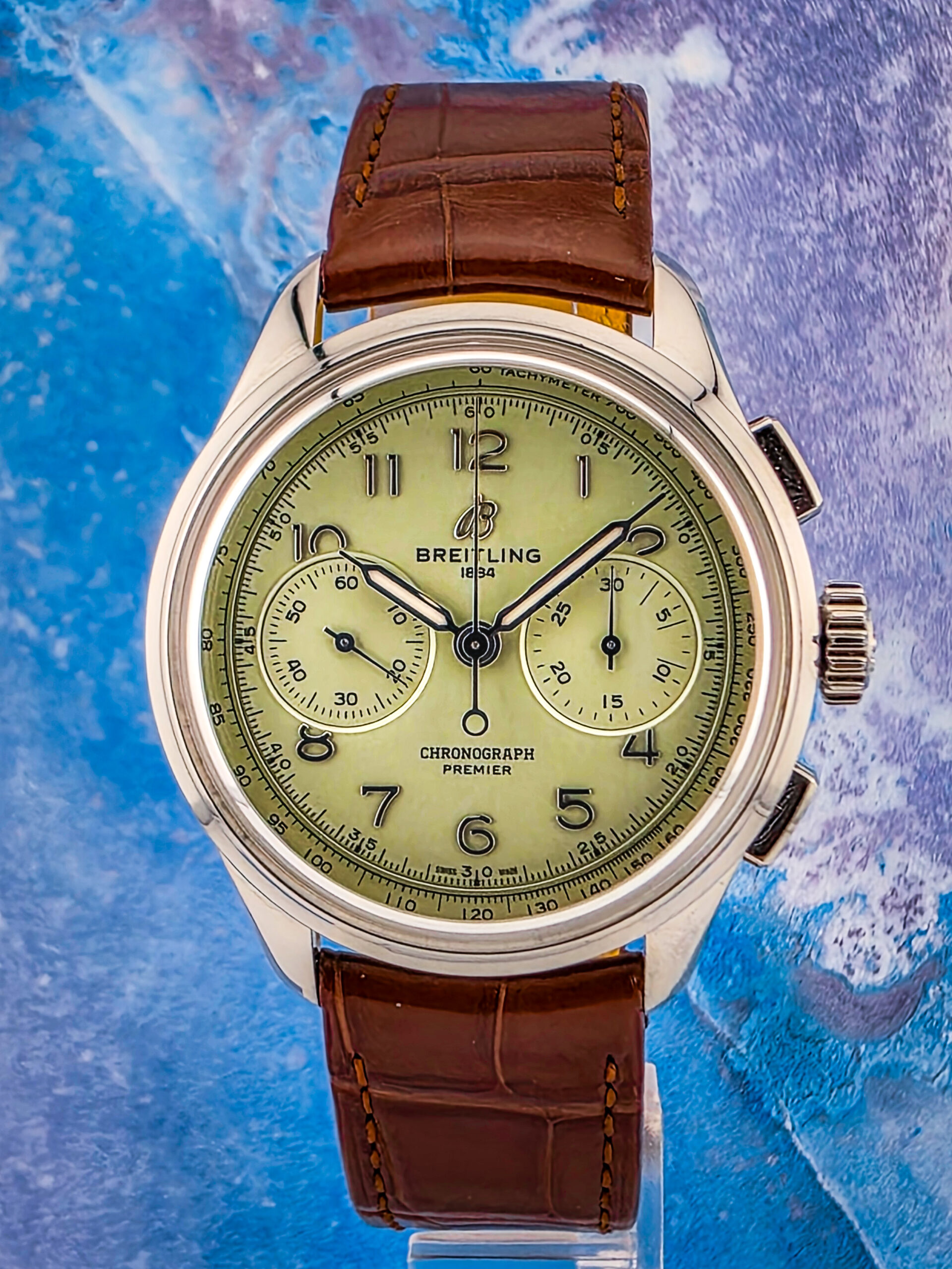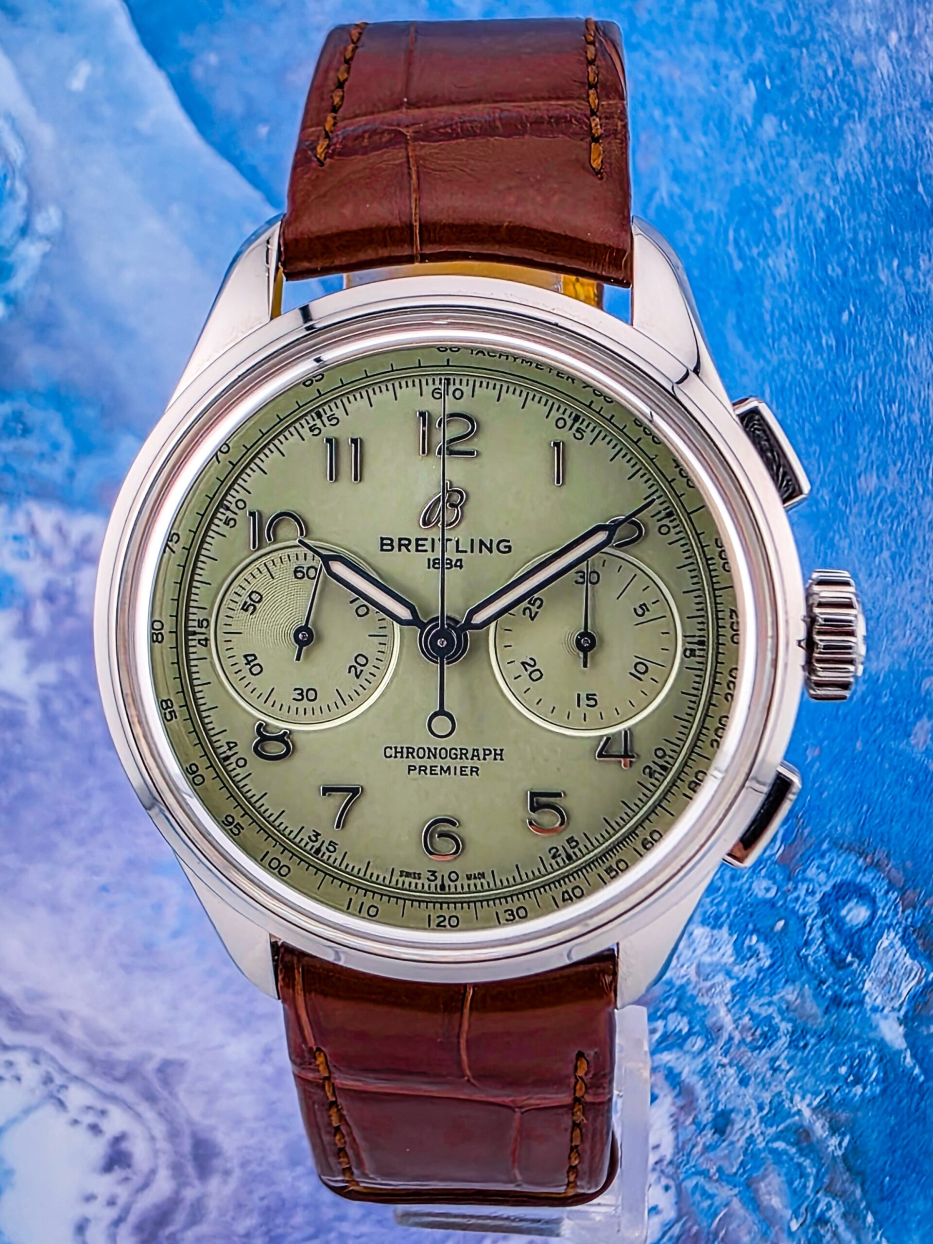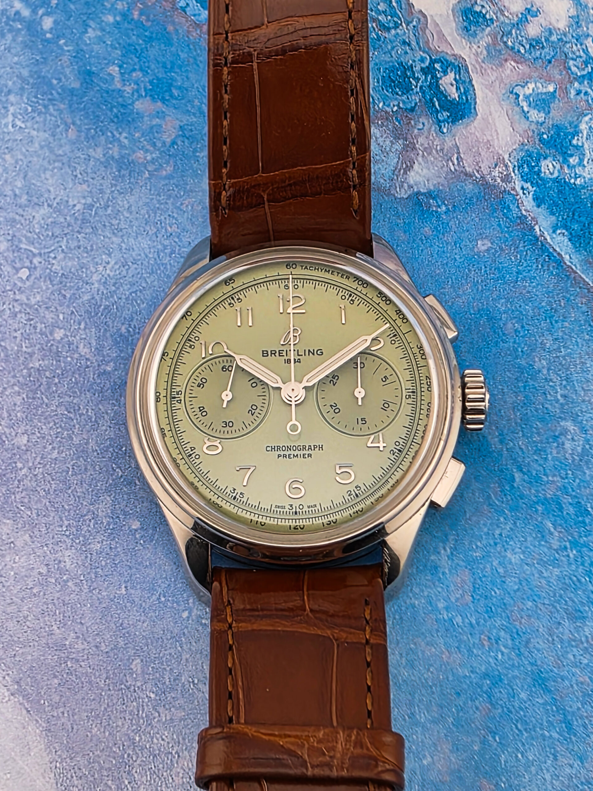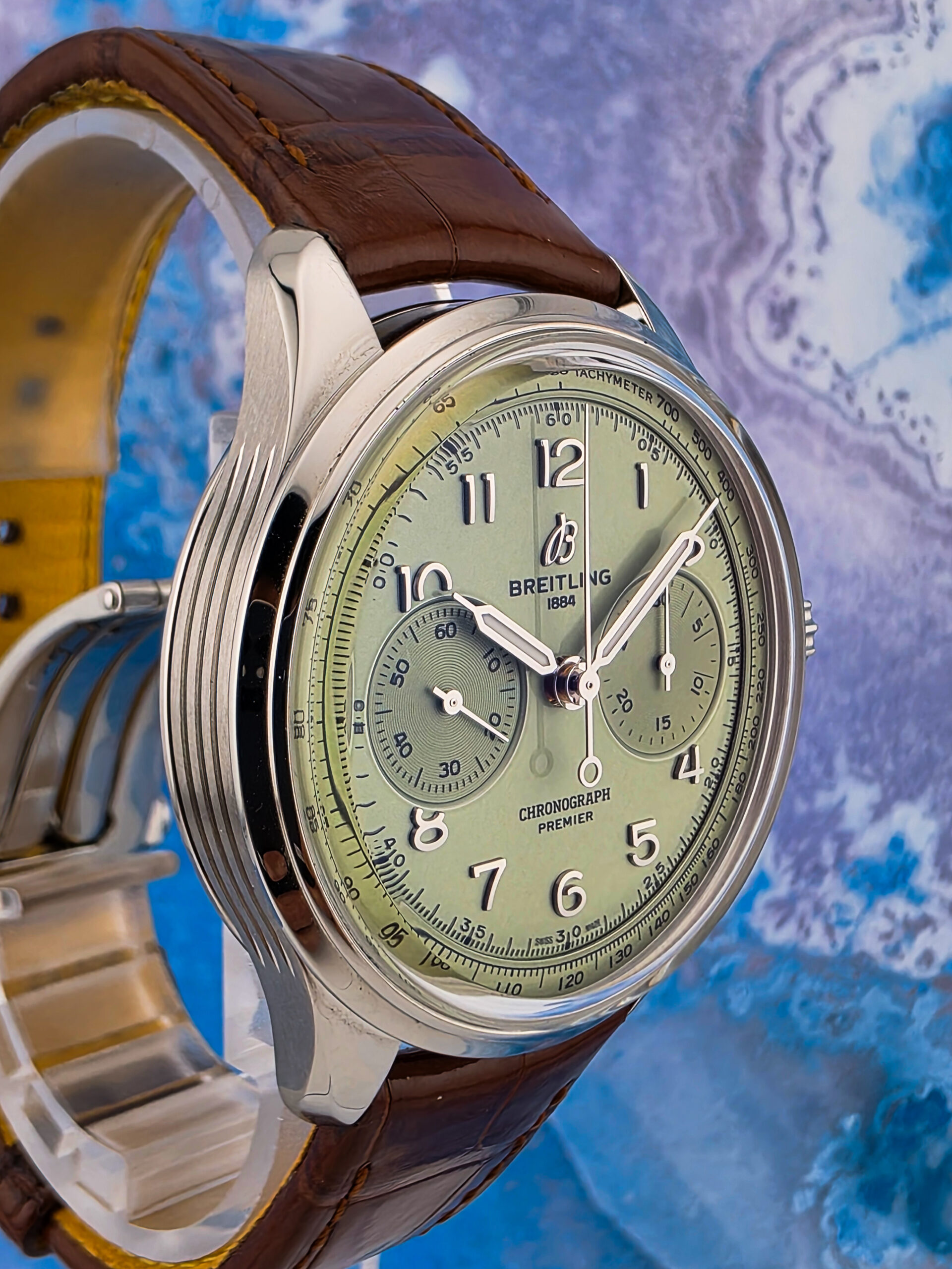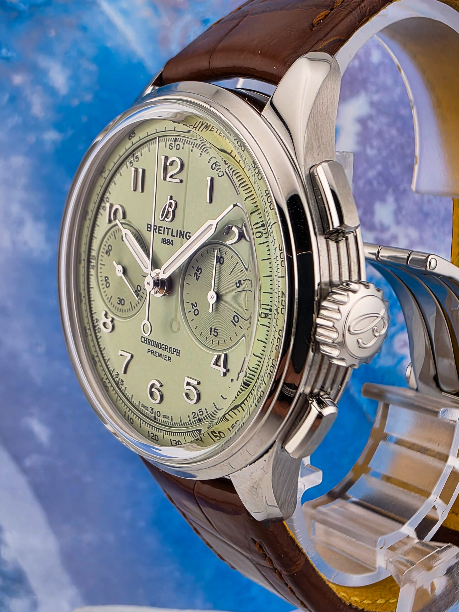 Reference: AB0930D31L1P1 – 2023 – Mint Condition DESCRIPTION: Captivating pistachio green dial with high-polish applied silver Arabic numerals. Inner tachymeter ring. Two bi-compax subdials: 30-minute counter at 3 o’clock, small seconds at 9 o’clock. Vintage-inspired silver-tone hands with luminous coating. 40mm stainless steel case, 13.08mm height. Grooved case sides, rectangular chronograph pushers. Cambered sapphire crystal with anti-reflective coating. Exhibition caseback. Water-resistant to 100 meters. Powered by Breitling manufacture Calibre B09 manual-wind chronograph with 28 jewels, column-wheel control, vertical clutch, 70-hour power reserve, COSC chronometer certified. Based on B01 architecture with automatic system removed. Gold brown alligator leather strap with stainless steel folding clasp. Warranty valid through January 28 2028. CONDITION: SCOPE OF DELIVERY: |