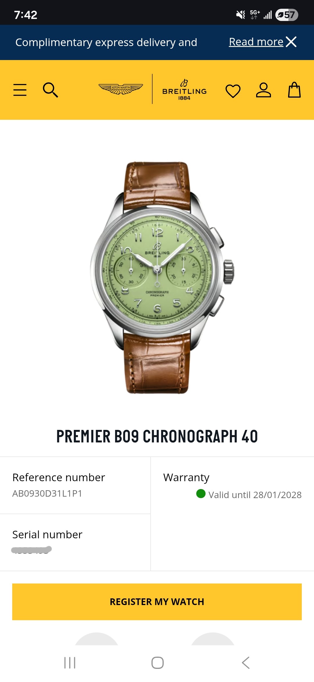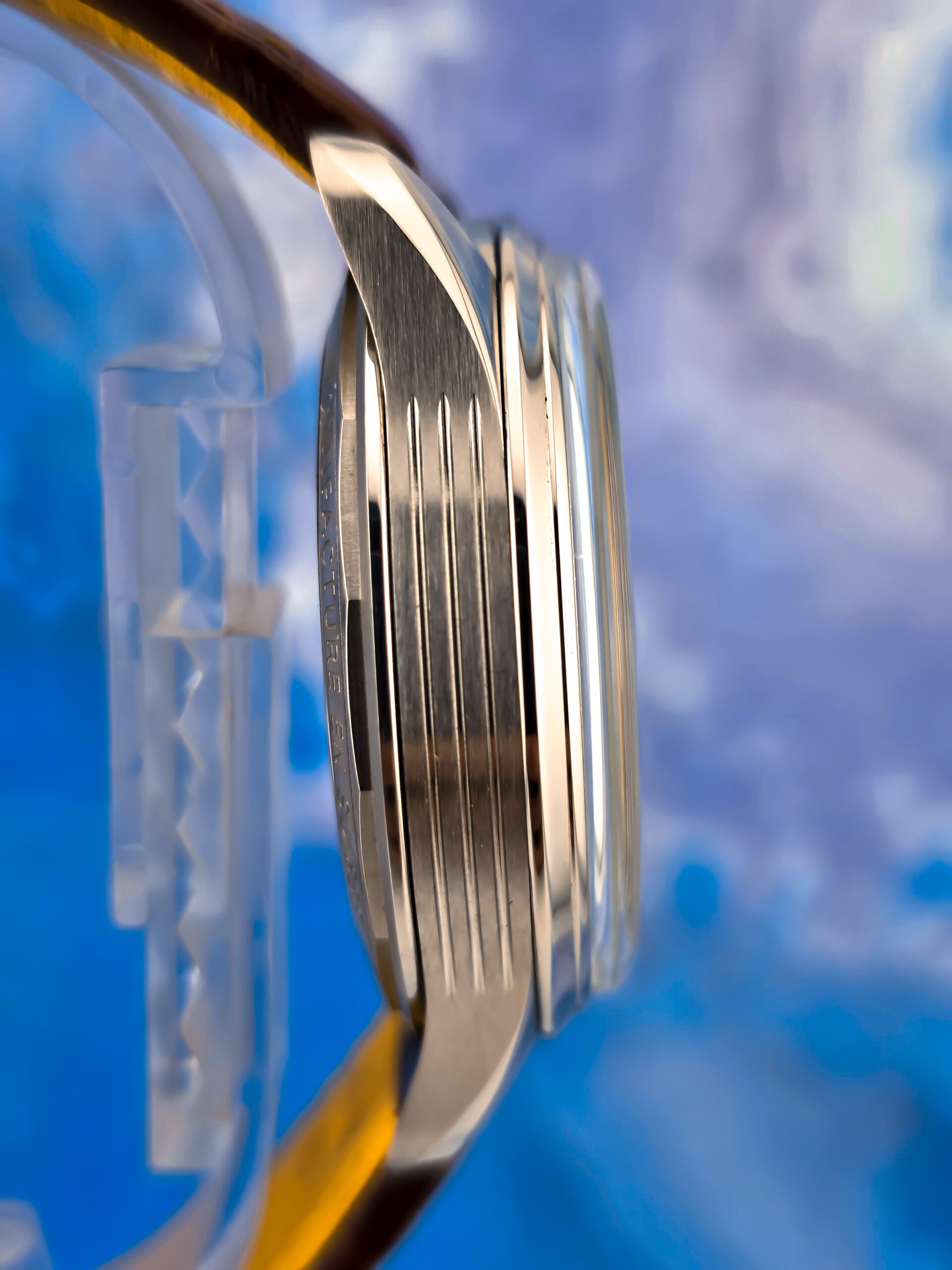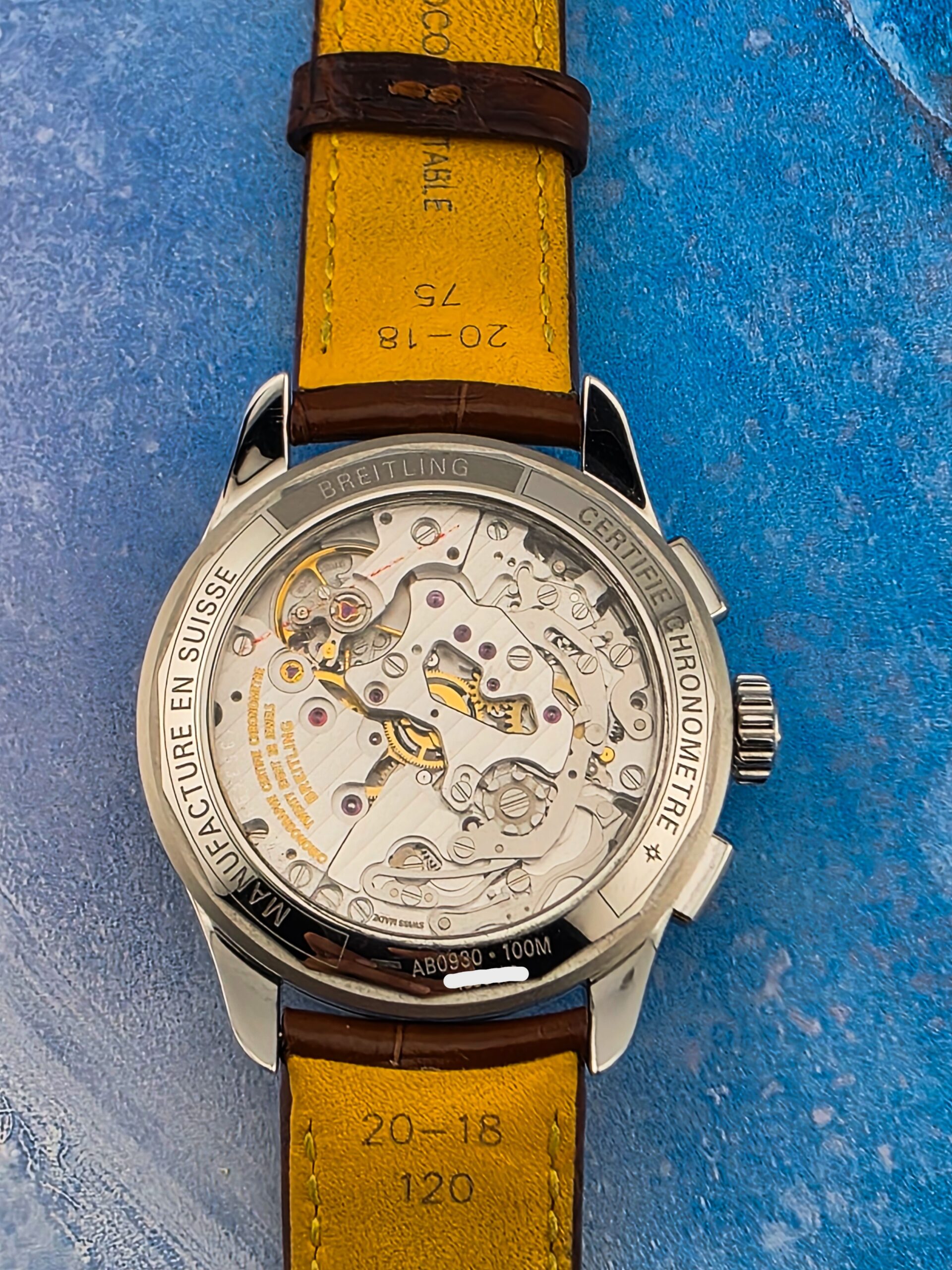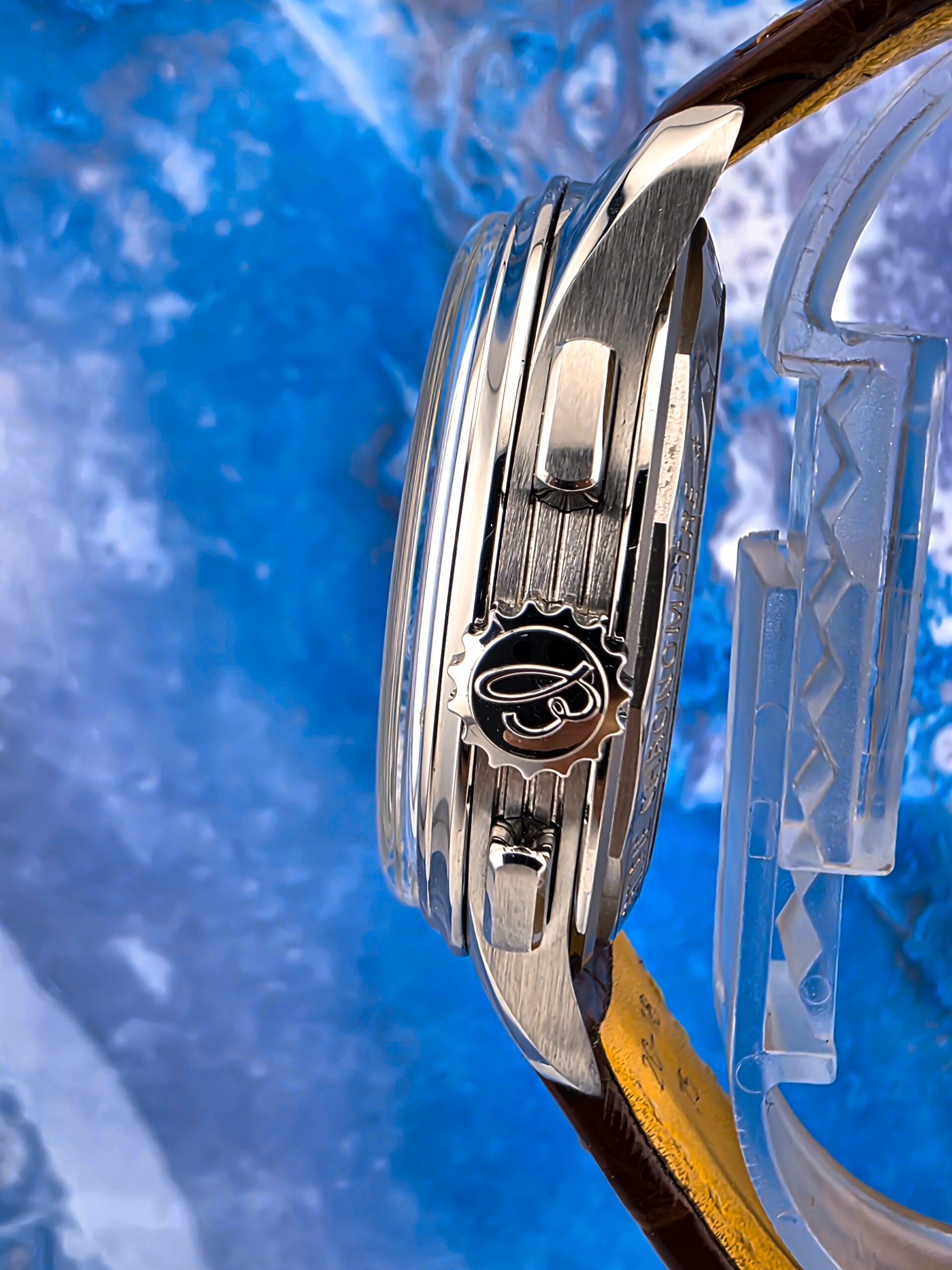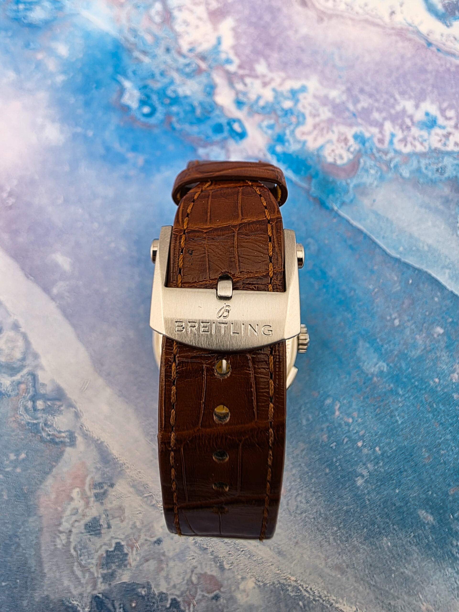 Reference: AB0930D31L1P1 – 2023 – Mint Condition DESCRIPTION: Captivating pistachio green dial with high-polish applied silver Arabic numerals. Inner tachymeter ring. Two bi-compax subdials: 30-minute counter at 3 o’clock, small seconds at 9 o’clock. Vintage-inspired silver-tone hands with luminous coating. 40mm stainless steel case, 13.08mm height. Grooved case sides, rectangular chronograph pushers. Cambered sapphire crystal with anti-reflective coating. Exhibition caseback. Water-resistant to 100 meters. Powered by Breitling manufacture Calibre B09 manual-wind chronograph with 28 jewels, column-wheel control, vertical clutch, 70-hour power reserve, COSC chronometer certified. Based on B01 architecture with automatic system removed. Gold brown alligator leather strap with stainless steel folding clasp. Warranty valid through January 28 2028. CONDITION: SCOPE OF DELIVERY: |