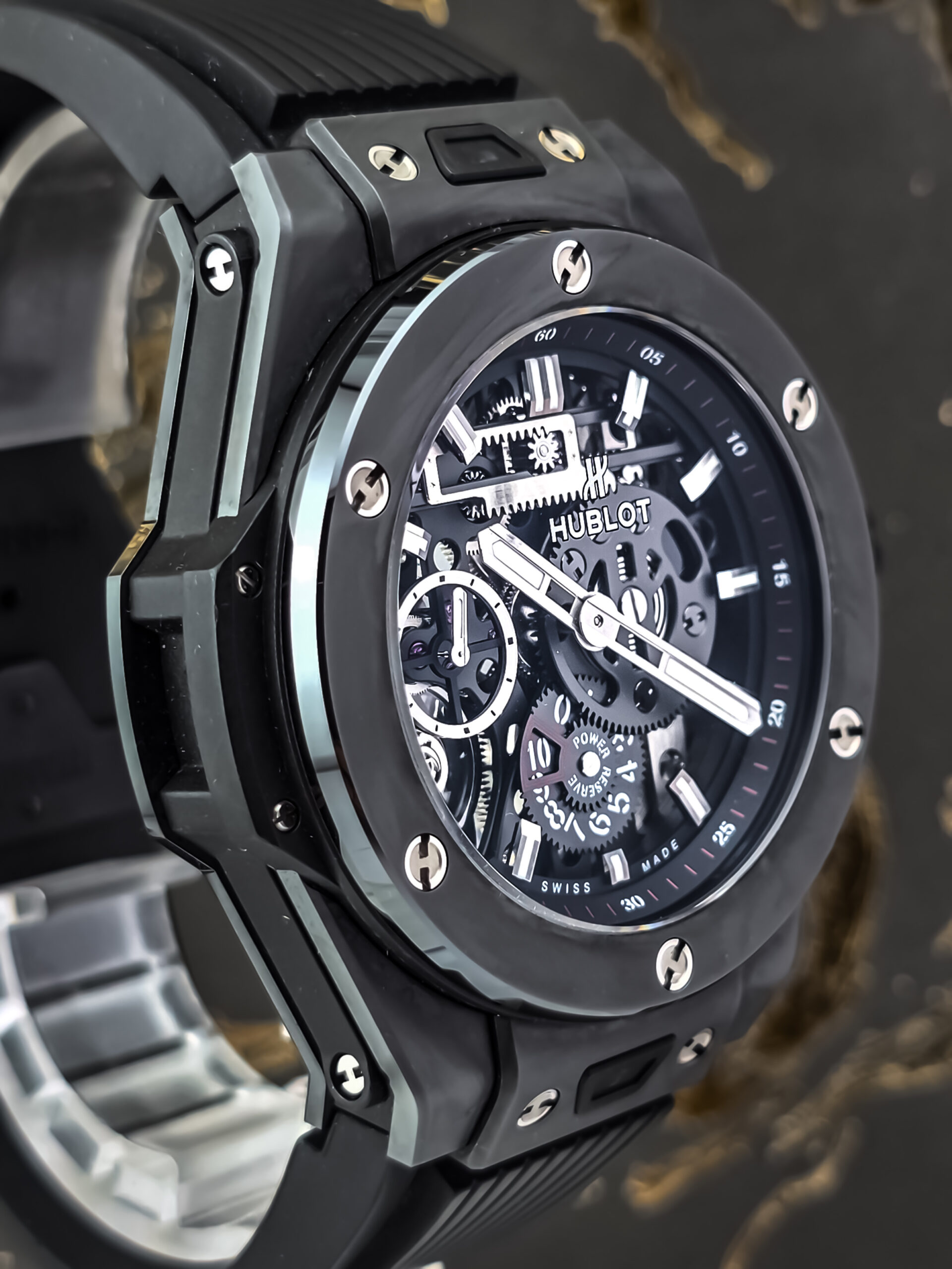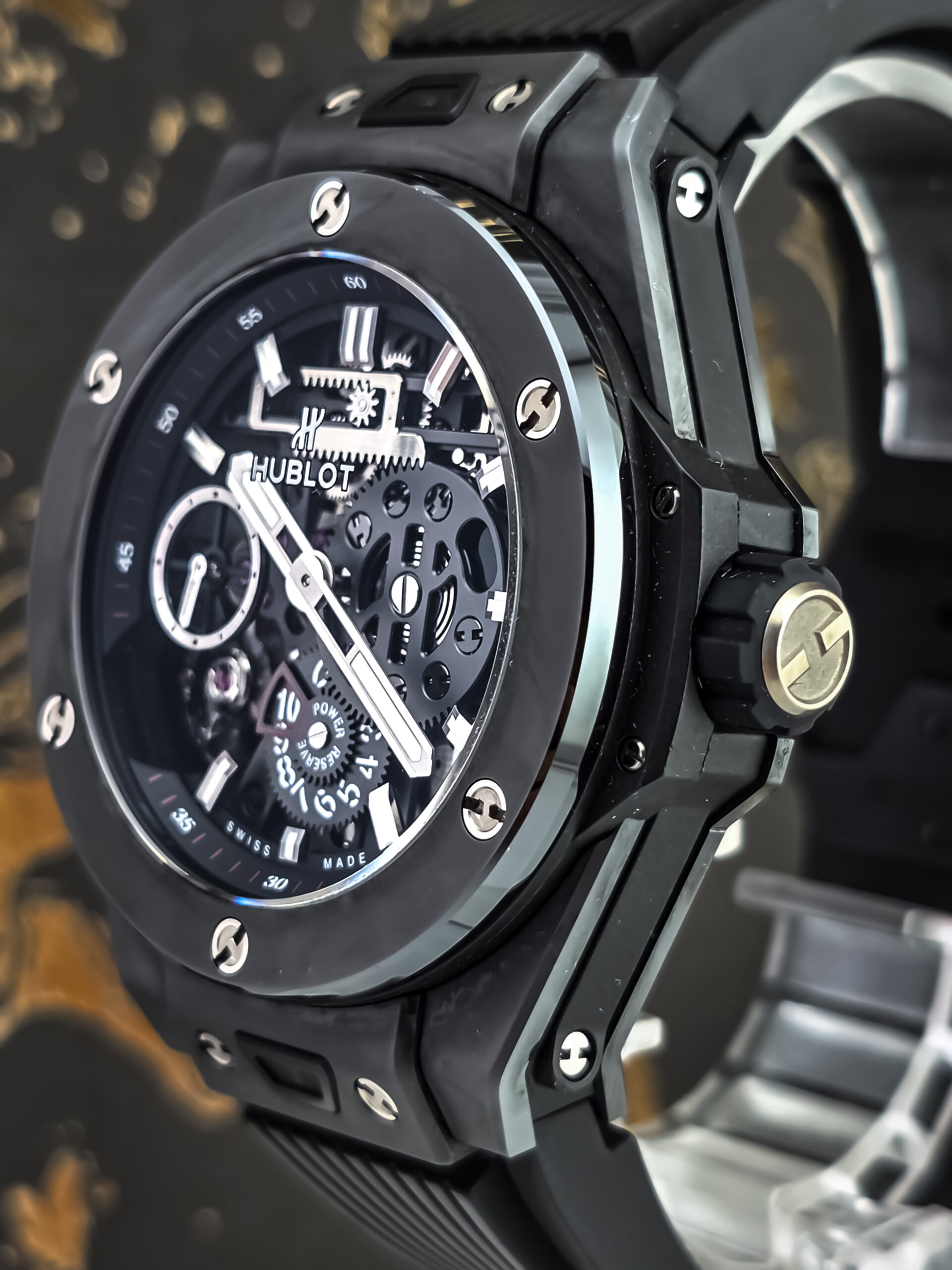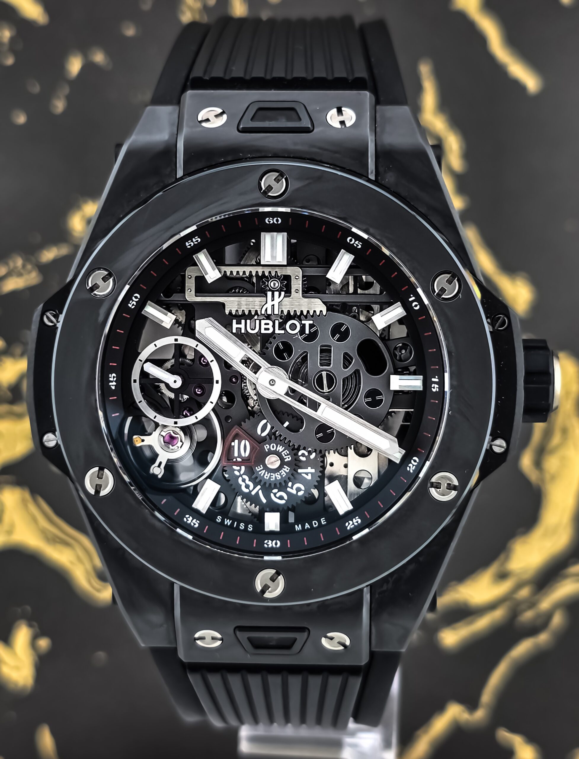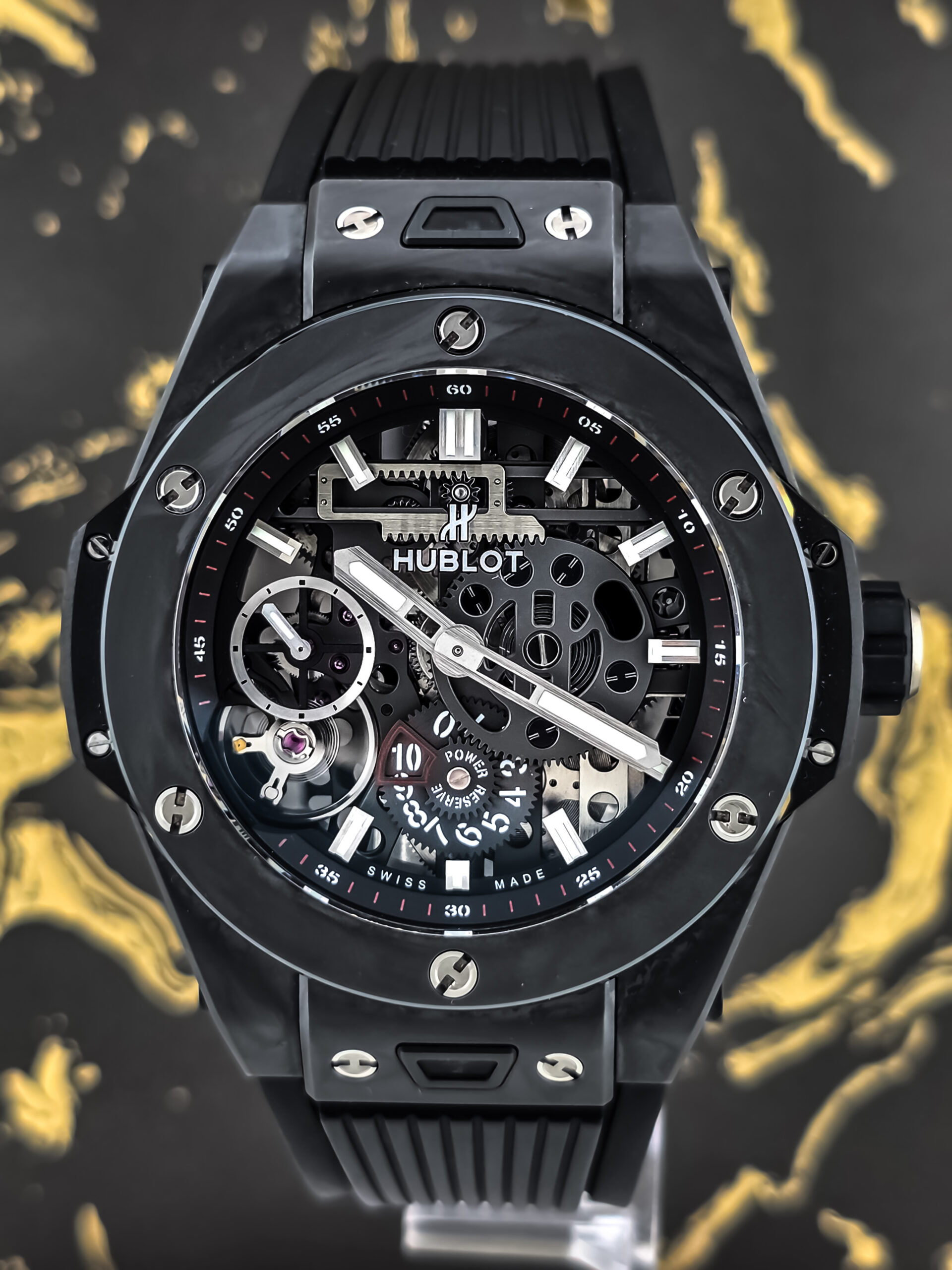 The Hublot Big Bang Meca-10 represents a significant achievement in modern watchmaking, showcasing the brand’s commitment to innovation and technical excellence. The “Meca-10” name refers to its impressive 10-day power reserve, a remarkable feat achieved through an innovative construction that replaces the traditional platinum base with long bridges fixed to a ring foundation. This revolutionary approach, combined with extensive skeletonization, creates a stunning three-dimensional effect that allows you to appreciate the movement’s complexity from every angle. The hand-wound Manufacture Calibre HUB1201, composed of 223 components with 65 jewels, demonstrates Hublot’s mastery of haute horlogerie. The “Black Magic” edition takes this technical achievement and wraps it in an all-black ceramic case with microblasted finishing, creating a timepiece that’s as visually striking as it is mechanically sophisticated—a perfect embodiment of Hublot’s “Art of Fusion” philosophy.
