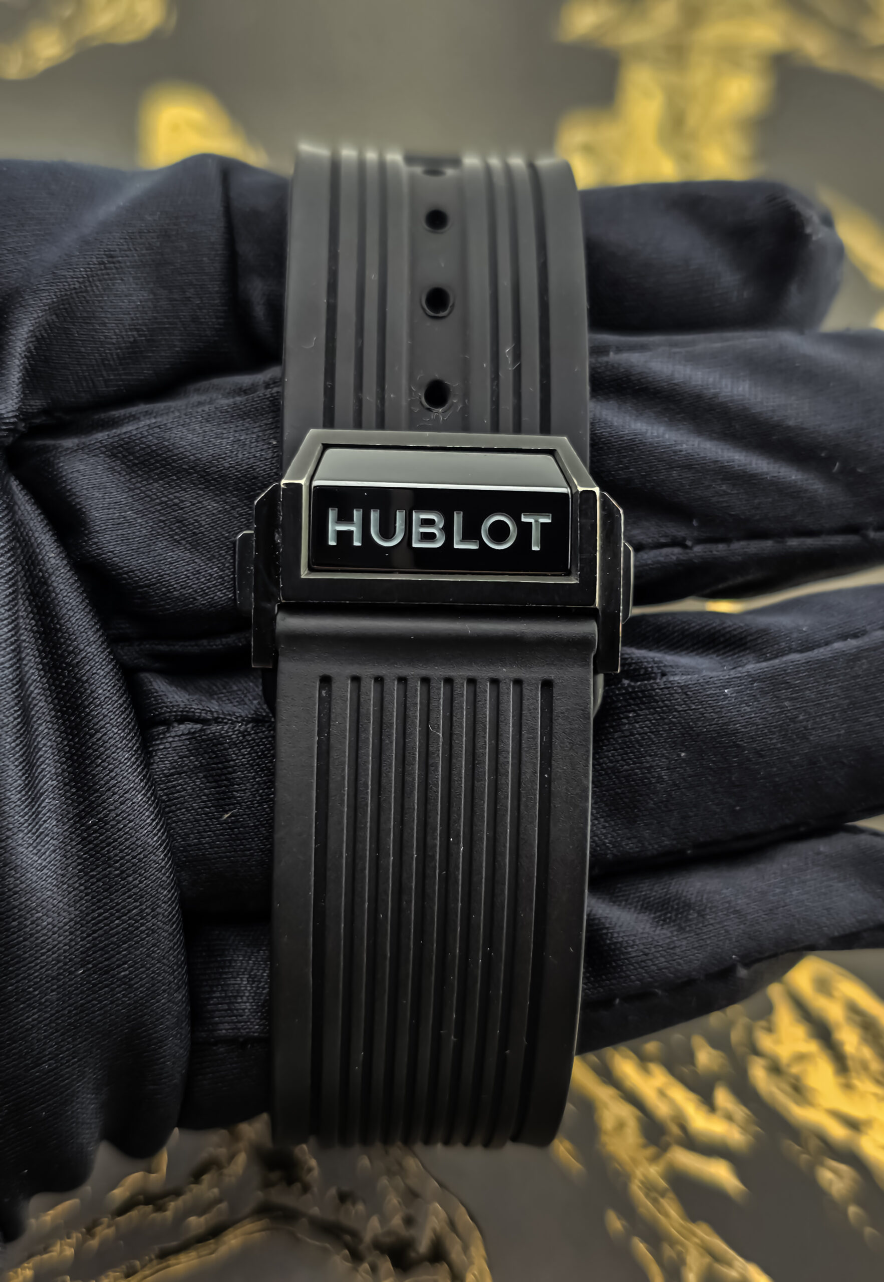 - Black structured rubber strap with deployant clasp