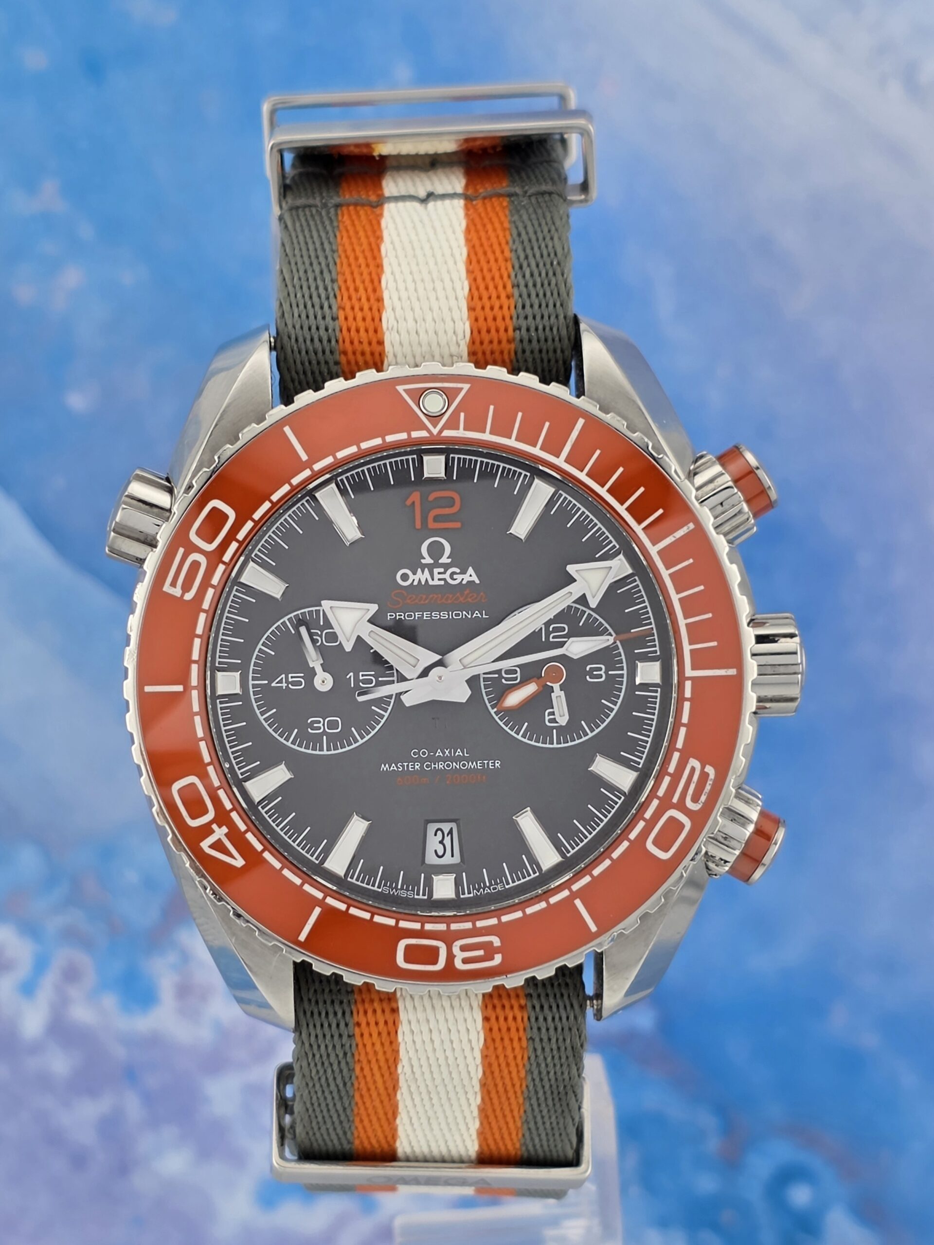 Experience the perfect fusion of Omega’s diving heritage and cutting-edge innovation with this stunning 2020 Seamaster Planet Ocean 600M Chronograph. This bold 45.5mm professional diver features a striking orange ceramic unidirectional bezel that pays homage to the signature color used when the Planet Ocean collection debuted in 2005. The eye-catching ceramised titanium dial showcases a slightly grained matte finish with rhodium-plated hands and indexes, complemented by vibrant orange accents including the varnished chronograph hand, the applied number 12, and the tip of the central seconds hand. The watch comes on Omega’s distinctive 5-stripe NATO strap in orange, grey, and white—a fresh, casual look that perfectly captures the sporty spirit of this professional diving chronograph.