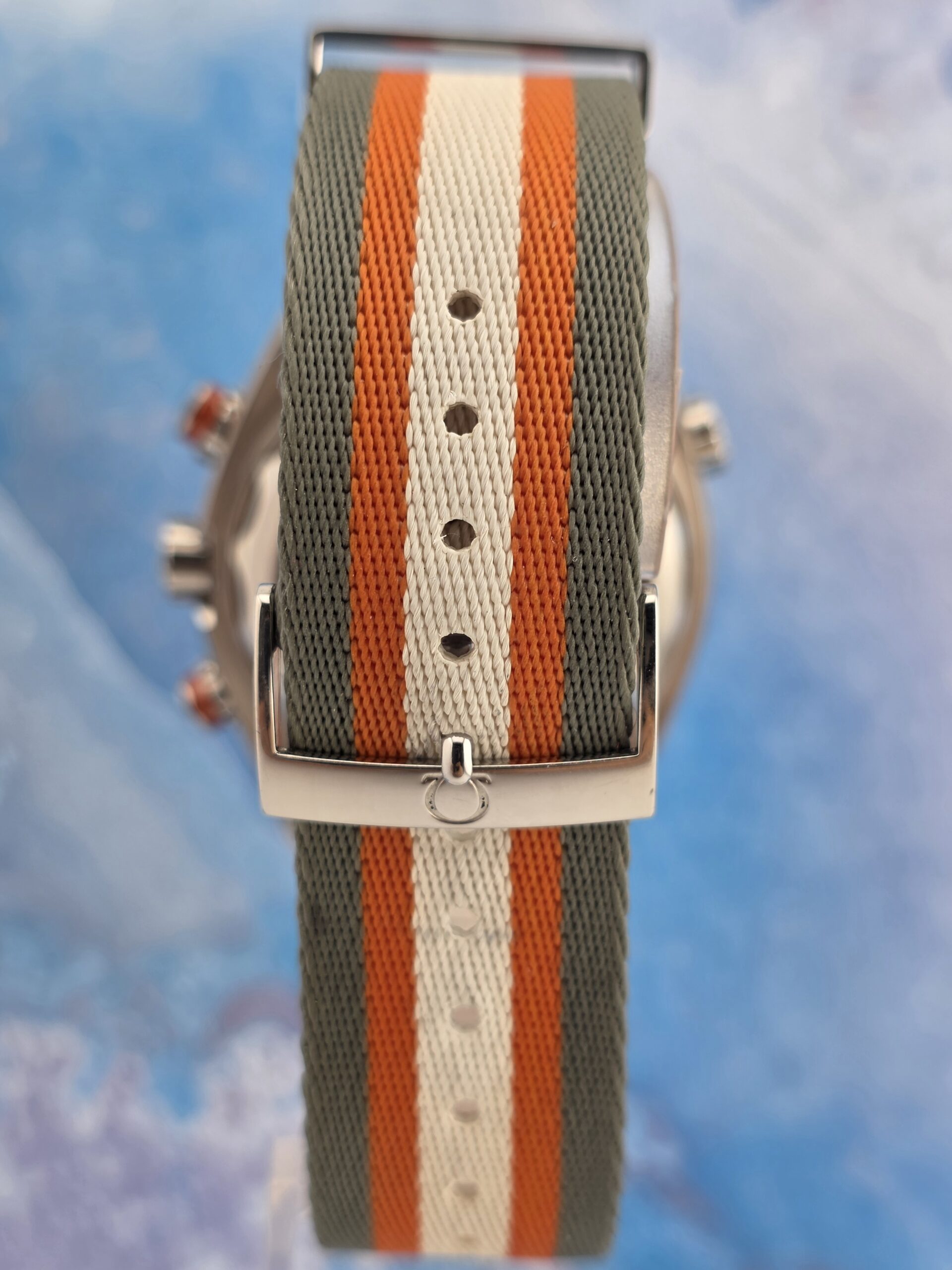 | Strap | 5-stripe polyamide NATO in orange, grey, and white with steel buckle |