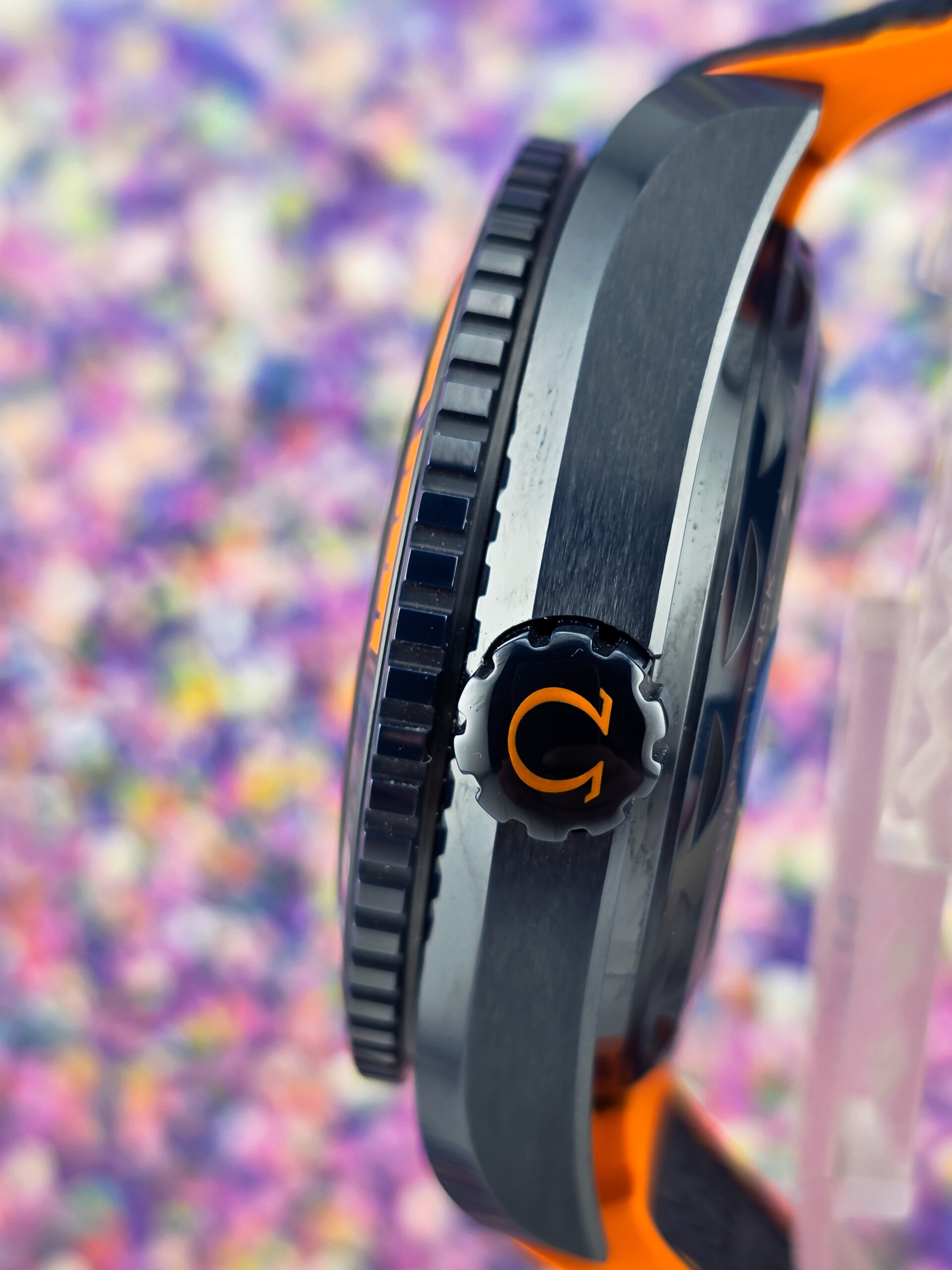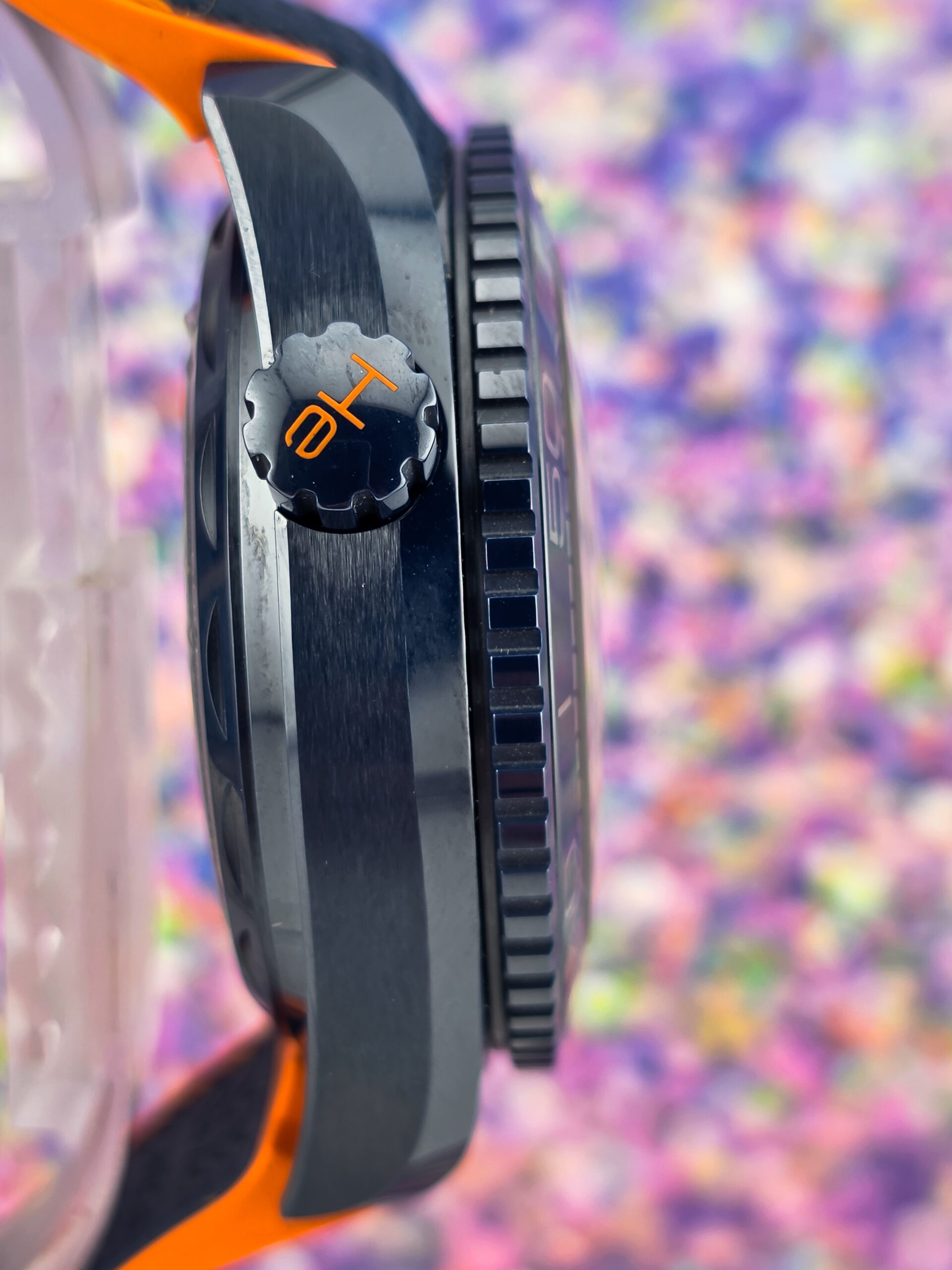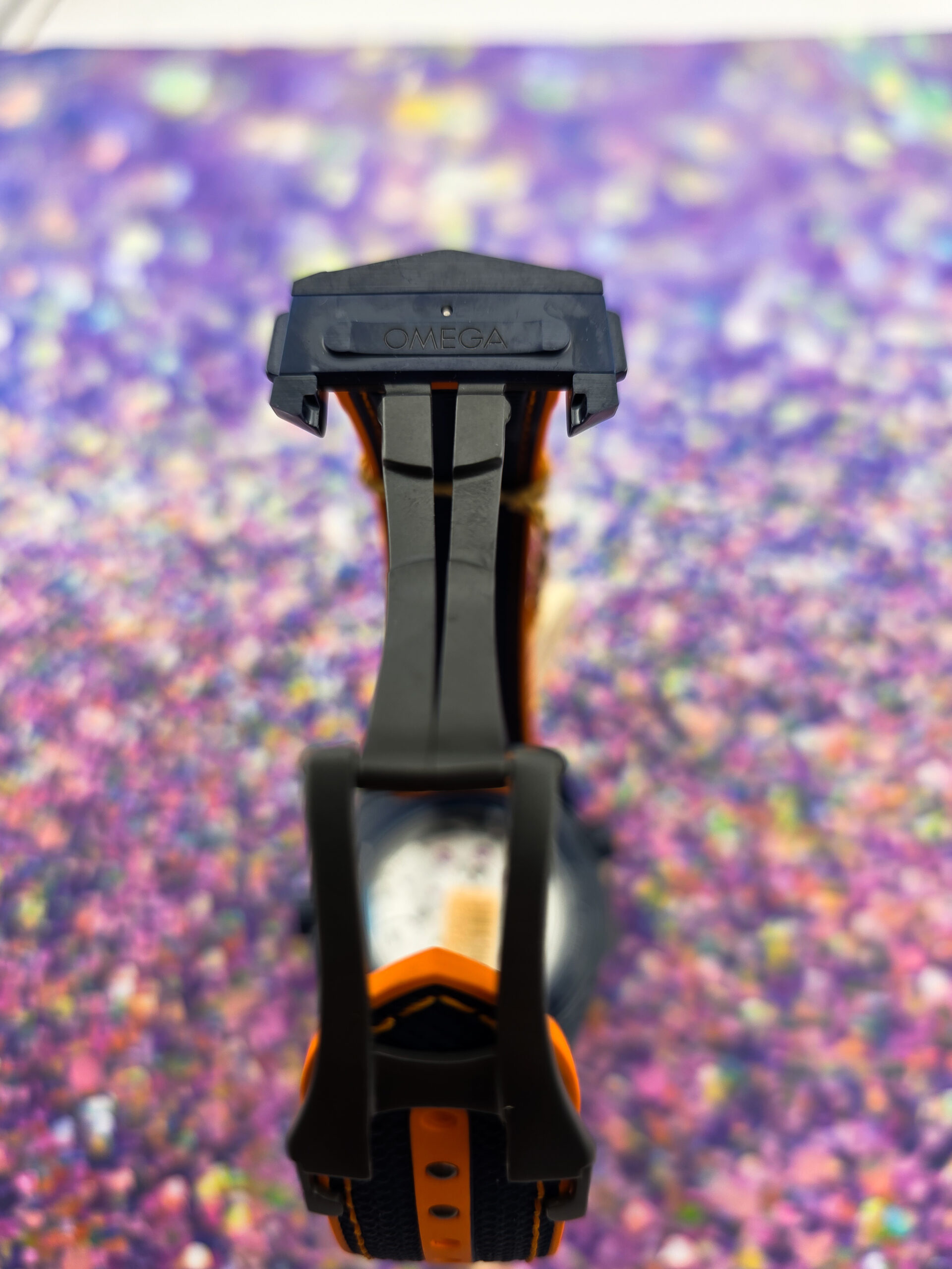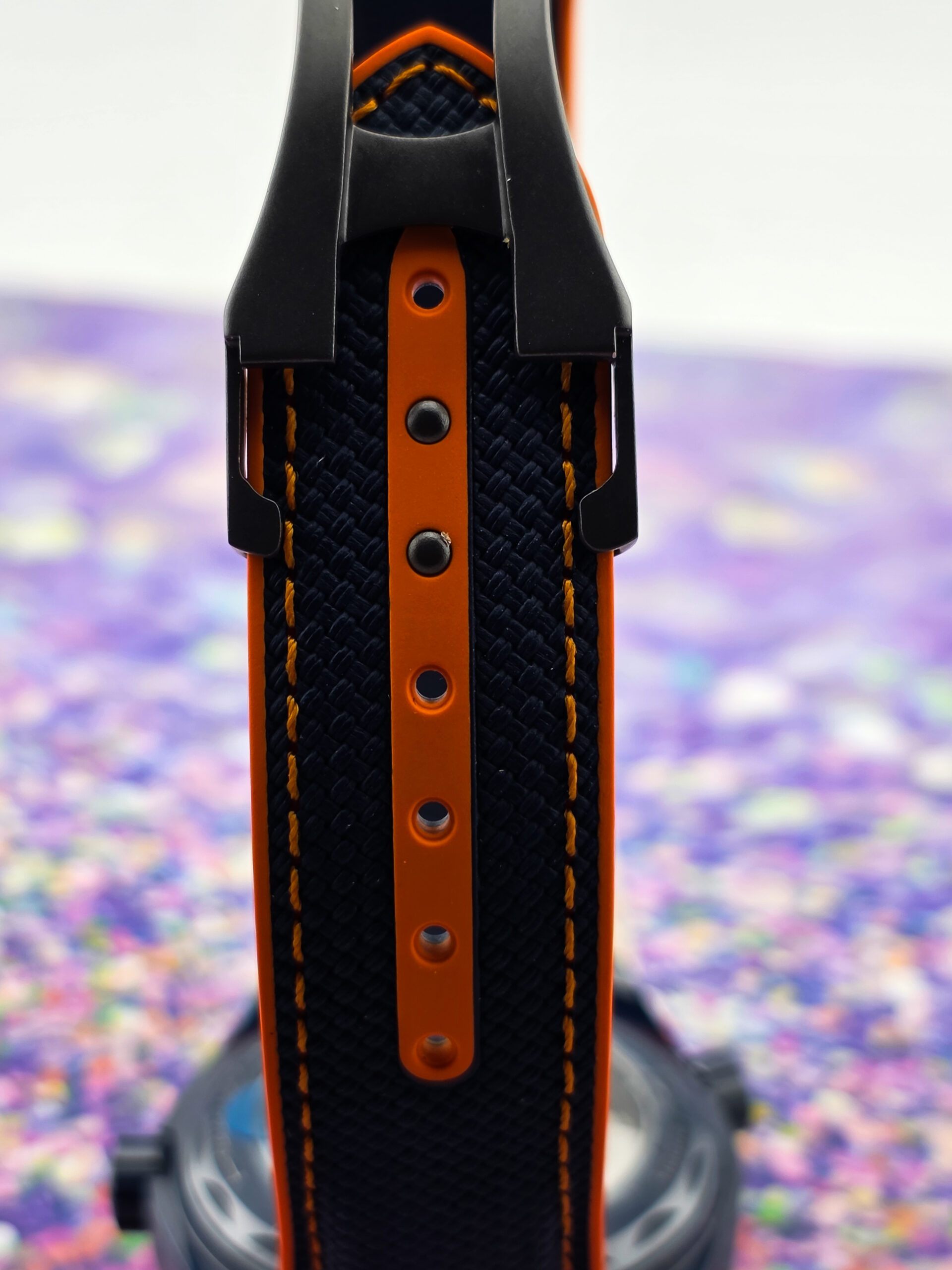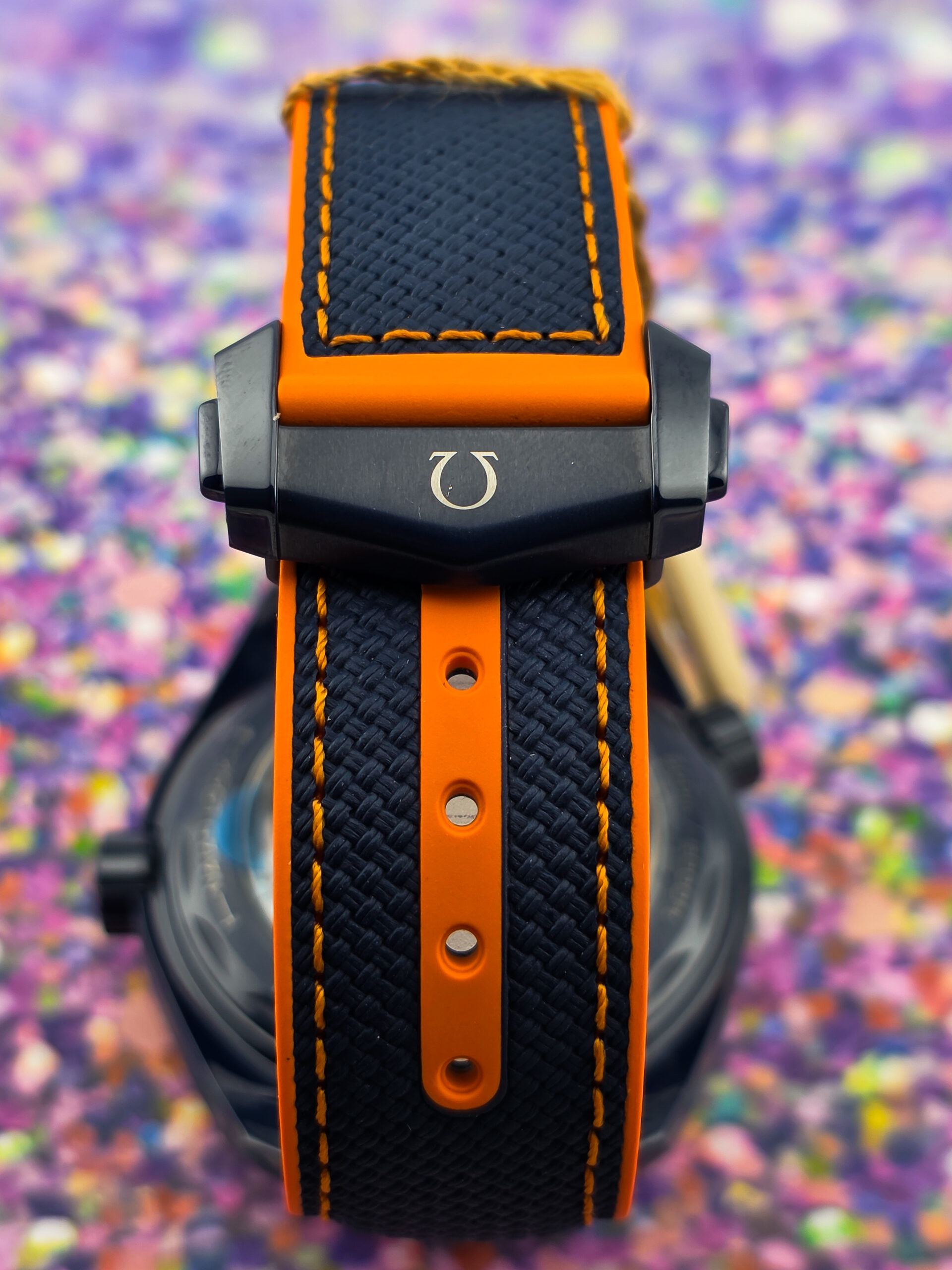 – Original blue rubber strap with orange stitching and lining with ceramic foldover clasp