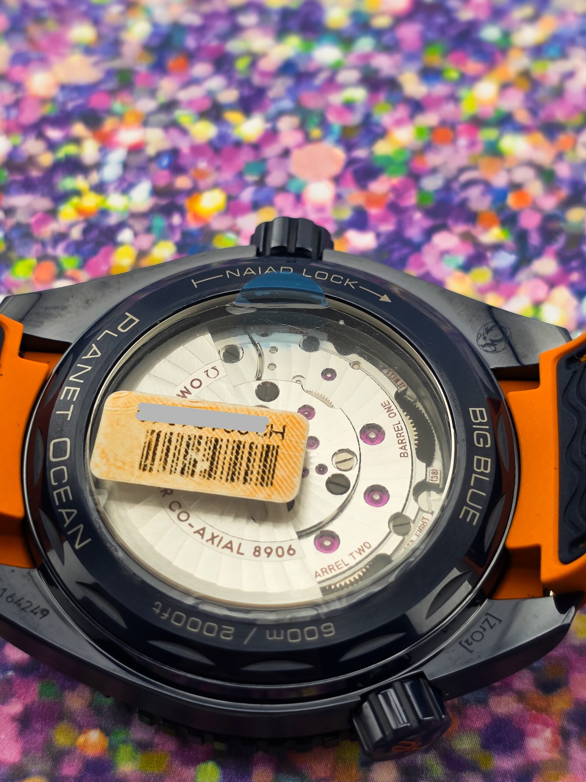 Powered by OMEGA Master Chronometer Calibre 8906 with 39 jewels, 60-hour power reserve, METAS certified, resistant to magnetic fields greater than 15,000 gauss. Blue rubber strap with orange stitching and ceramic clasp. Warranty card dated March 1 2026 valid through March 1 2031.