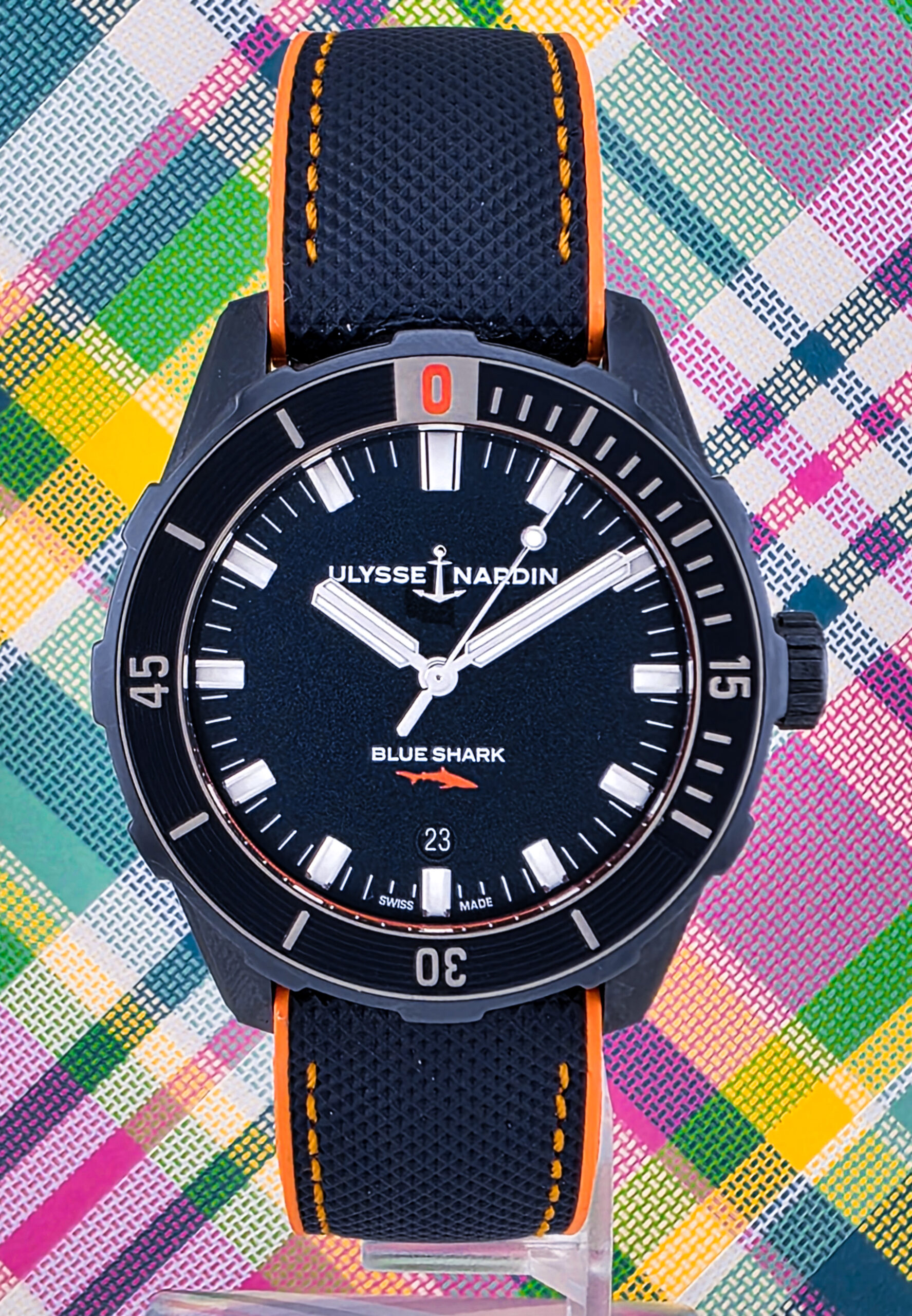 Own one of the most exclusive dive watches ever created—the Ulysse Nardin Diver Blue Shark Limited Edition, with only 300 pieces produced worldwide. This exceptional 42mm timepiece is instantly recognizable by its stunning blue PVD-coated stainless steel case and matching blue ceramic bezel, creating a monochromatic aesthetic that perfectly captures the essence of the ocean depths. The sandblasted blue dial features a unique wave-pattern rubber inlay on the bezel and striking orange accents throughout—a bold color combination that pays tribute to the apex predators of the sea. The case back is engraved with “BLUE SHARK,” making this watch’s limited edition status immediately apparent. This is not just a beautiful watch—it’s a statement of Ulysse Nardin’s commitment to ocean conservation, as the brand actively supports shark preservation efforts and reducing marine plastic pollution through partnerships with environmental organizations.